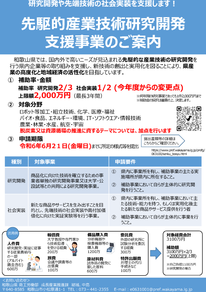 和歌山県では、研究開発や先端技術の社会実装の支援を目的に、先駆的産業技術研究開発支援事業を実施しています。